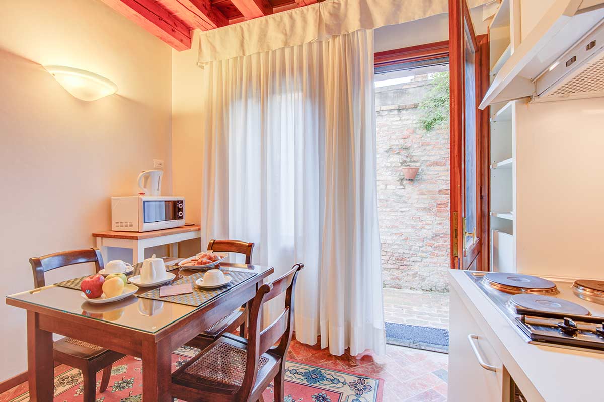 Tipica abitazione veneziana, l’appartamento è composto da una camera da letto matrimoniale, un salotto con divano letto matrimoniale, un bagno finestrato con doccia e una cucina completamente attrezzata da cui si accede ad una piccola corte interna ad uso privato.