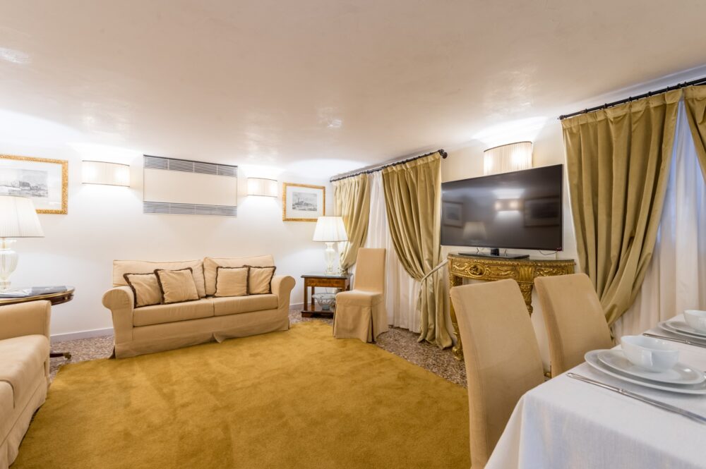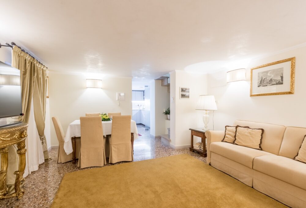 Elegant two-level apartment of approx. 65 sqm with independent access, featuring a private courtyard for exclusive use within the garden of the historic Palazzo Ca’ dei Cuori on the Grand Canal.