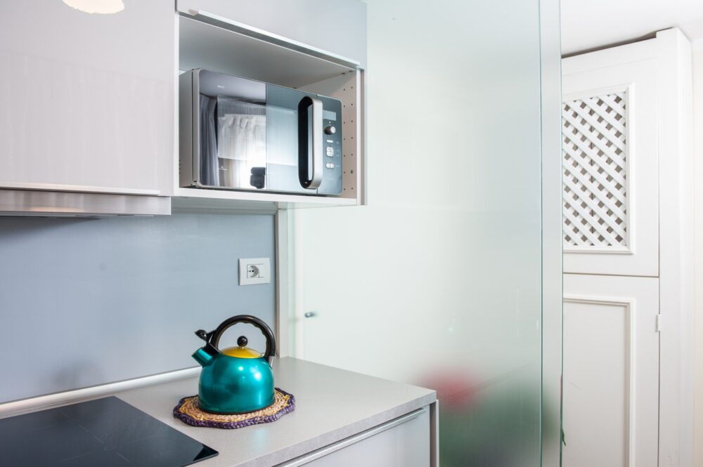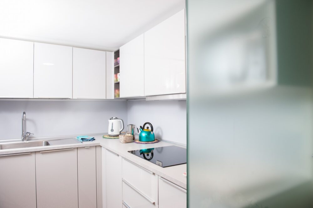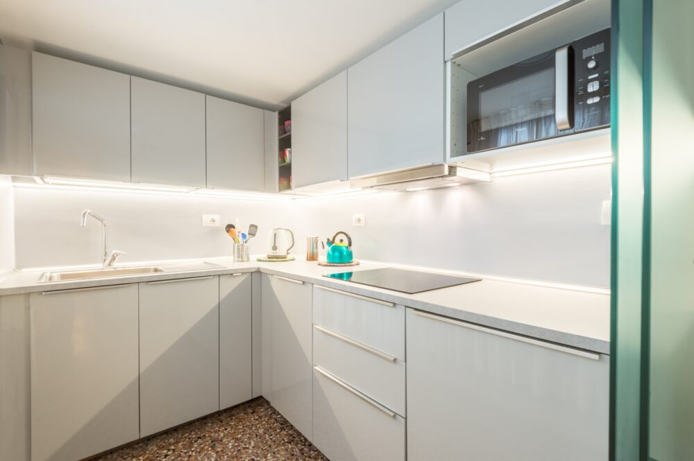 Ground floor: modern kitchen and living room with a comfortable double sofa bed.