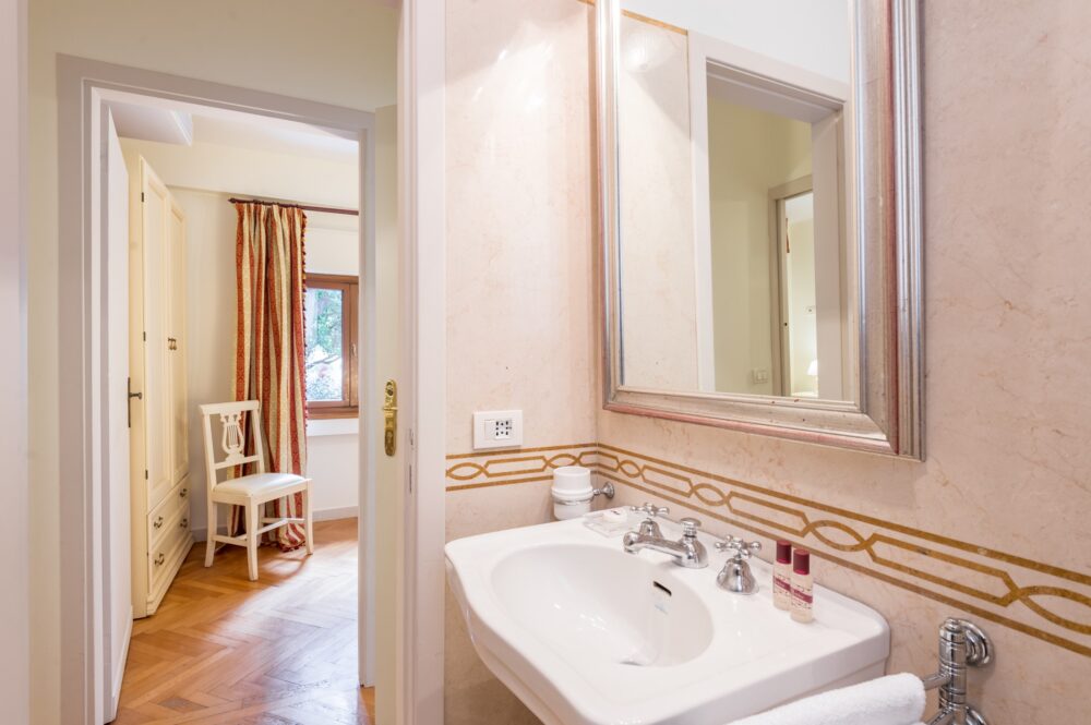 The windowed bathroom, entirely in marble and located on the second floor, is equipped with bidet, shower, and hairdryer.